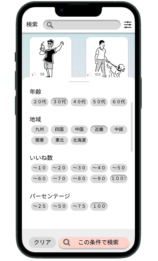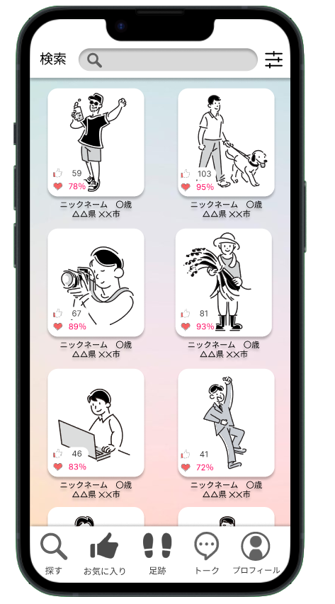 年齢や地域、いいね数、マッチング率などの検索条件から好みの人を見つけます。